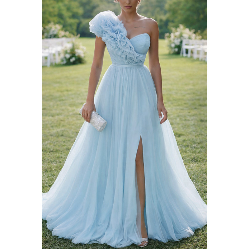 Ball Gown A-Line Floor Length Prom Dresses Elegant Sleeveless One Shoulder Prom Quinceanera Tulle Cowl Back with Embroidered Flower Ruffles Slit