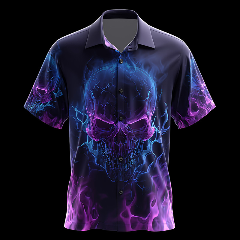 Men's Skull Flame Neon Glow Shirt Button Up Shirt Short Sleeve Dark Gothic Style Outdoor Vacation Summer Spring Turndown 3D Print Collared Shirts Black Dark Blue