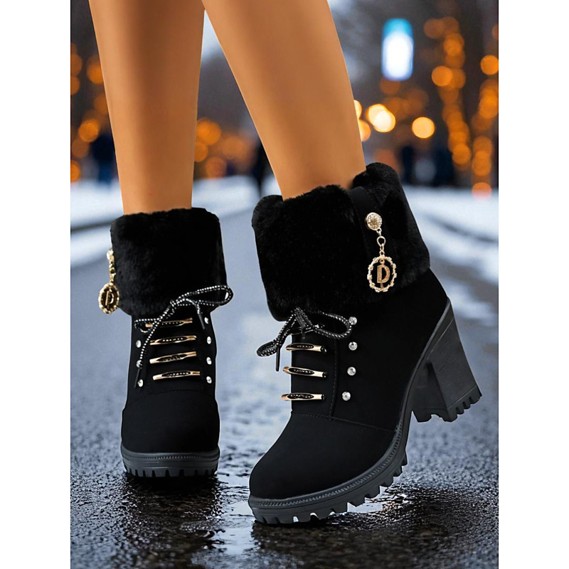 Women's Black Faux Fur Lace-Up Ankle Boots with Chunky Heels – Warm Winter Snow Boots for Christmas Markets, Casual and Trendy Streetwear