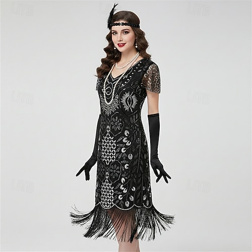 Set Retrò Vintage Anni Ruggenti Anni 1920 Lunghezza al ginocchio Abito Flapper Abito da cocktail Costume di fantasia con accessori Maniche corte Il grande Gatsby Ragazza Flapper Paillettes Frangia