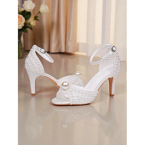sandali da sposa con tacco alto decorati con perle e cinturino alla caviglia, eleganti scarpe da sposa aperte per la sposa, tacchi di lusso decorati con perle per la cerimonia ricezione