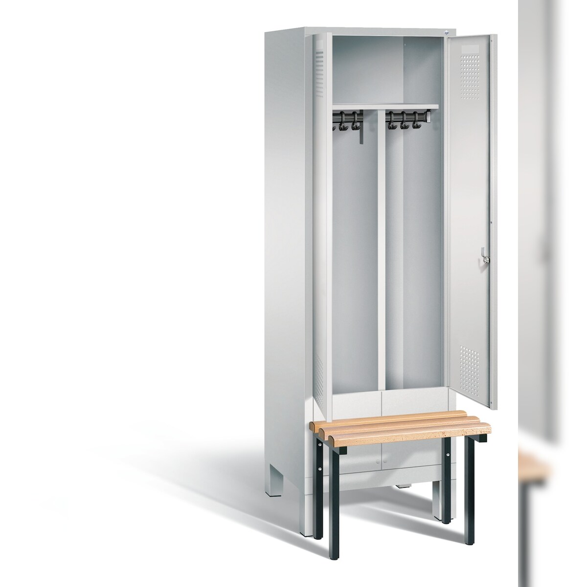C+P Spind Classic PLUS, Buche untergebaute Sitzbank 2 Abteile, HxBxT 212x80x82cm, Zylinderschloss, Hellgrau/Lichtblau von PROREGAL