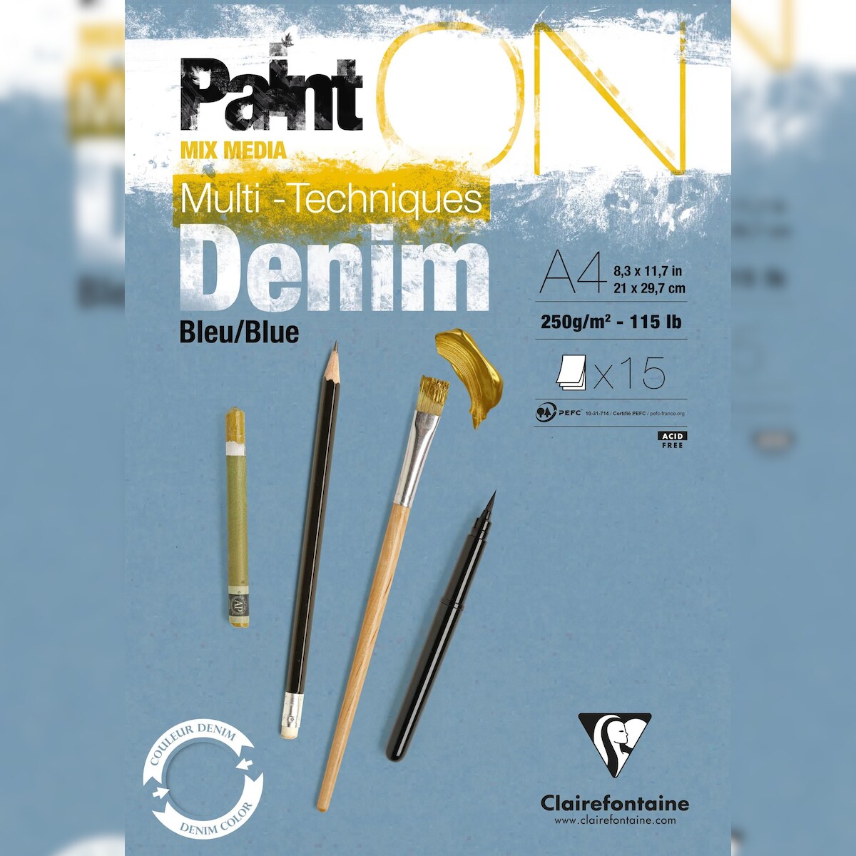 Clairefontaine 4x PaintON Denim, Block A4, kopfseitig geleimt, 15 Blatt, 250g, denimblau, Mixed Media - Denim 975701C