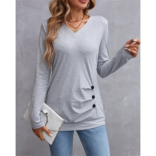 Per donna Maglietta Tinta unica Semplice Elegante Vintage Moda Manica Lunga Scollo a V Top Regolari Quotidiano Uscire Weekend Patchwork Bottoni Nero Bianco Vino Grigio chiaro Primavera Autunno