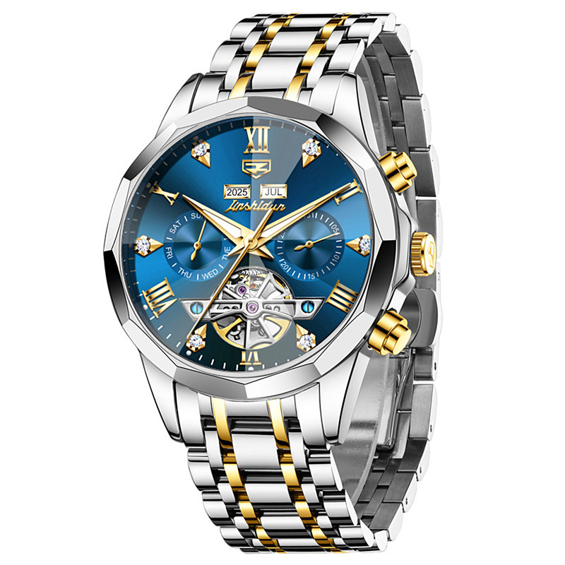 OLEVS Men Automatic Watch Leather Strap Calendar Skeleton Dial Trend Classics Male Waterproof Moonswatch Wristwatch 7009