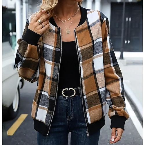 Per donna Giacca Invernale Antivento Caldo Cerniera Quotidiano Griglia Vacanza Casuale Regolare Collo alla coreana Vestibilità regolare Manica Lunga Capispalla Vino Rosso Verde Primavera Autunno