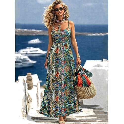 Per donna Abito maxi Vestito Estivo Abito a trapezio Abito Sottoveste Vacanza Casual Spiaggia Uscire Vestibilità comoda Grafico Paisley Tribale Senza Maniche Scollo a V Verde Estate Primavera