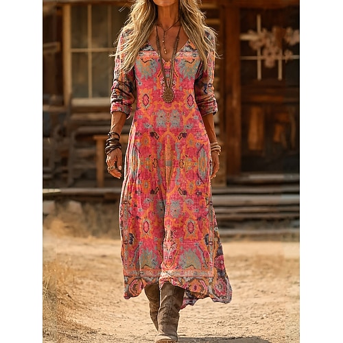 Per donna Abito maxi Vestito Estivo Abito Estivo Vacanza Casual Boho Quotidiano Vestibilità comoda Grafico Blocco di colori Etnico Manica Lunga Scollo a V Rosa Arancione Verde Arancione chiaro Estate