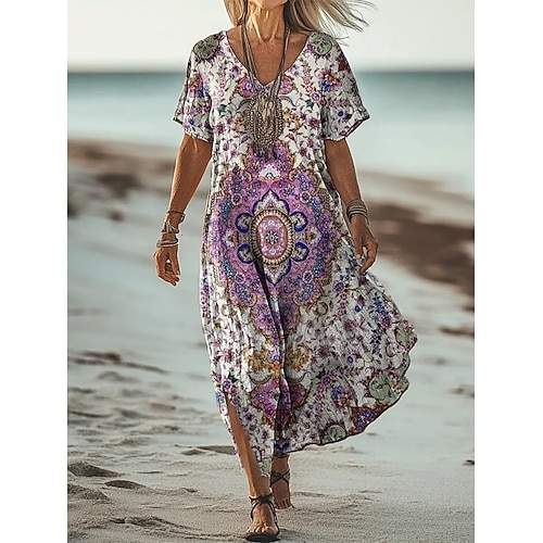 Per donna Abito maxi Vestito Estivo Vestito T-Shirt Abito a trapezio Vacanza Casual Spiaggia Uscire Vestibilità comoda Floreale Grafico Tribale Manica Corta Scollo a V Rosso Viola Arancione Estate