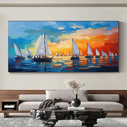 Quadro da parete con barche a vela colorate, arte astratta blu, immagine di barca a vela sull'oceano, pittura costiera moderna, opera d'arte con texture per soggiorno, camera da letto, cucina,