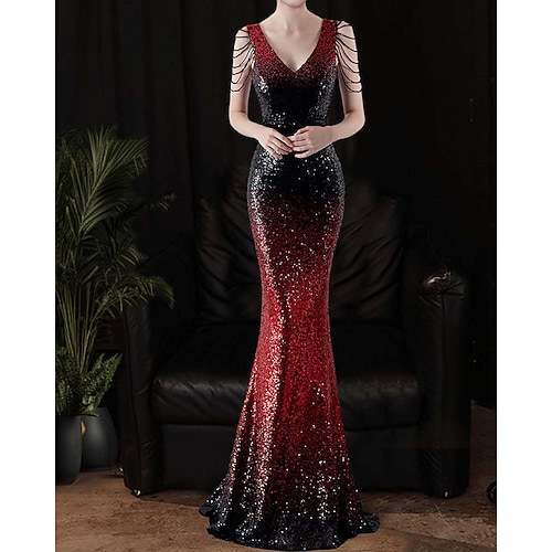 Abiti da Prom Sirena Tromba in Paillettes Abito Ombre Festa Abito Cocktail Formale Lunghezza fino al Pavimento Senza Maniche Collo a V con Perline e Paillettes