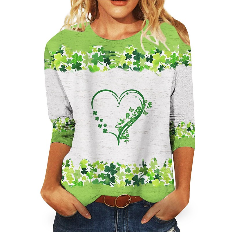 St. Paddy's Day St. Patrick's Day Women's T Shirt Heart Leaf St. Patrick's Day Long Sleeve Round Neck Regular Tops Holiday Weekend Print Grass Green White Ivory Light Green Army Green