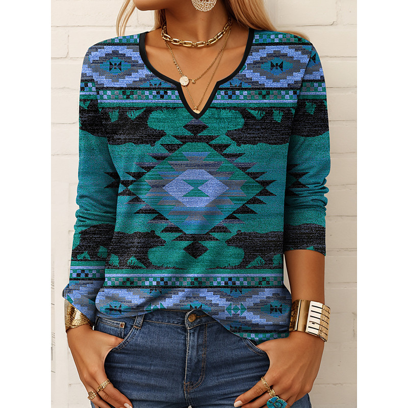 Women's T shirt Long Sleeve Graphic Geometric Vintage Stylish Classic Long Sleeve Notched Neck Regular Tops Daily Weekend Print Red Blue Purple Green Spring Fall Prefall