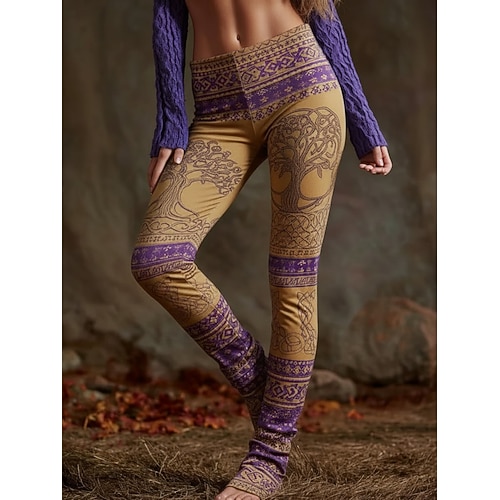 Damen-Leggings im Wikinger-Stil, kuschelig, für Urlaub, Vintage-Look, Ethno-Stil, lange Länge, hoher Bund, Grafikprint, bequem, dehnbar, für Freizeit, Urlaub, Alltag, gelb, lila, Frühling, Herbst,