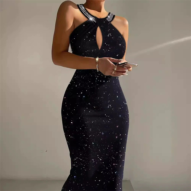 Women's Midi Dress Black Dress Sequin Dress Party Dress Casual Dress Elegant Fashion Modern Outdoor Party Daily Slim Plain Sleeveless Halter Neck Black Spring Autumn