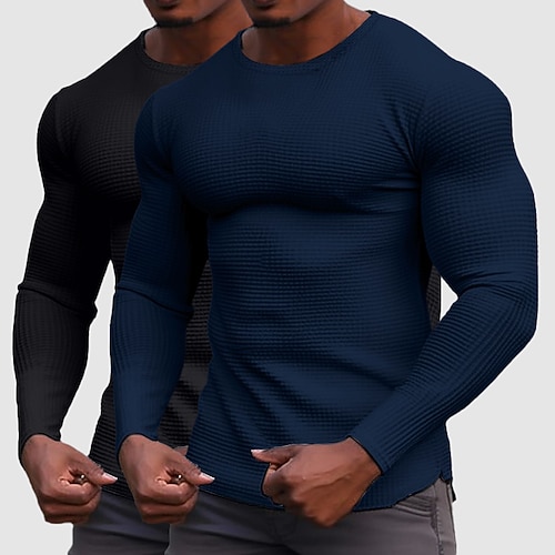 Herren Waffelhemd T Shirt T-Shirt Langarmshirt Langarm Rundhalsausschnitt Frühling Herbst Ganzjahres Einfach Mode Designer Basic 2 teilig Mehrfachpackung Gestrickt Urlaub Straße Lässig