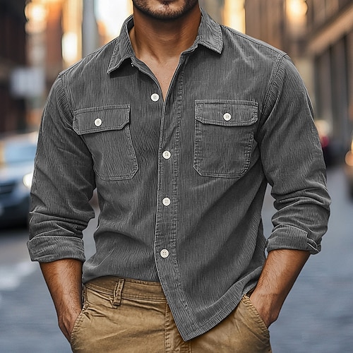 Per uomo Camicia di Velluto a Coste Nero Viola Marrone Grigio Manica Lunga Semplice Colletto Collo ripiegato Casuale All'aperto Tasca Abbigliamento Vintage Classico Casual