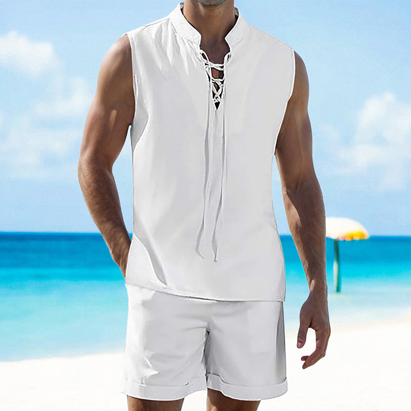 Men's 2 Piece Shirt Set Summer Set Matching Sets Beach Wear Plain Vacation Daily Black White Navy Blue Khaki Sleeveless Collar Summer Clothing Apparel