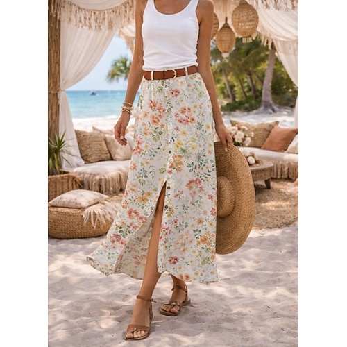 gonne lunghe casual da donna a vita alta con stampa floreale e doppie punte casual in finto cotone e lino per tutti i giorni blu rosa chiaro giallo rosa estate