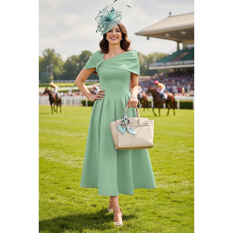 A-Line Tea Length Derby Dress Mother of the Bride Dress Short Sleeve Cowl Neck Elegant Vintage Kentucky Derby Satin with Ruching Solid Color
