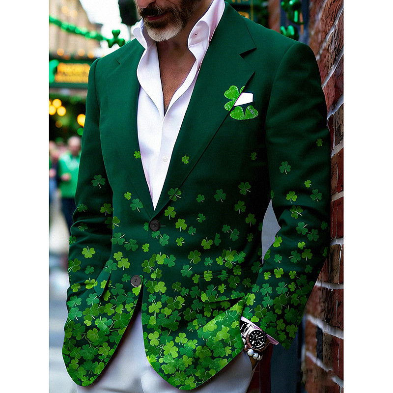 St. Patrick Men's Shamrock Blazer Comfortable Breathable Business Casual Daily Party Evening Wear Festival Pocket 3D Print Buttons Summer Fall Notch Long Sleeve Sage Dark Green