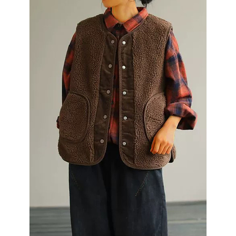 Women's Vest Shearling Vest Comfortable Pocket Buttons Casual Plaid Vacation Daily Wear Going out Weekend Regular Crewneck Regular Fit Sleeveless Outerwear Black Khaki Light Grey Fall Winter