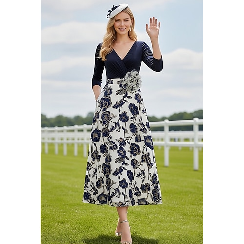 Linea ad A Lunghezza Tè Abiti da Cocktail Elegante Vintage Floreale Manica 3/4 Scollo a V Festa in giardino Matrimonio Tasca Raso Jacquard con Stampa floreale Pieghe Tasca