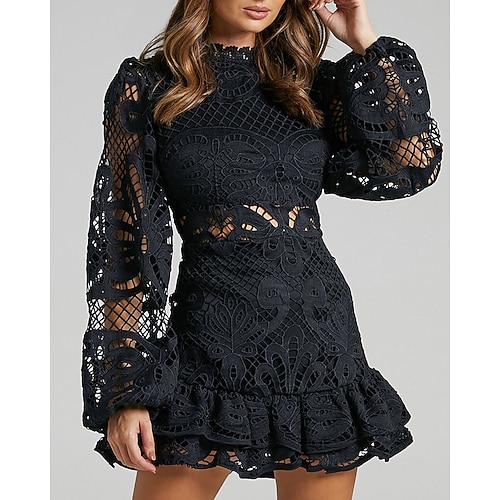 Per donna Mini Abito Abito nero Abito in Pizzo Abito ritagliato Tubino Moda Moderno Manica a rete Manica a Lanterna Ufficio Uscire Vestibilità regolare Floreale Manica Lunga Collo alla coreana Blu