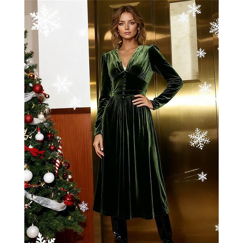 Women's Midi Dress Christmas Dress Velvet Dress Cocktail Dress Elegant Vintage Fashion Daily Outdoor Evening Party Slim Plain Long Sleeve V Neck Dark Green Spring Autumn