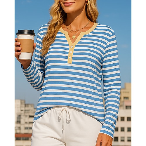 Per donna Maglietta A righe Classico Casual Manica Lunga Girocollo Top Regolari Quotidiano Uscire Bottoni Blu Nero Vino Marrone Bianco sporco Primavera Autunno