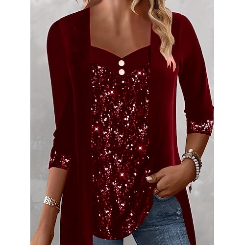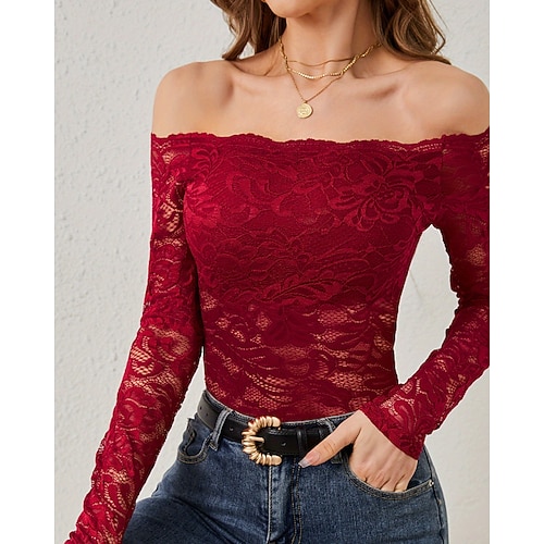 Per donna Maglietta Top con cuciture in pizzo Tinta unica Elegante Moda Carino Manica Lunga Girocollo Scollo a V Top Regolari Quotidiano Uscire Weekend Pizzo Patchwork Nero Bianco Vino Verde militare