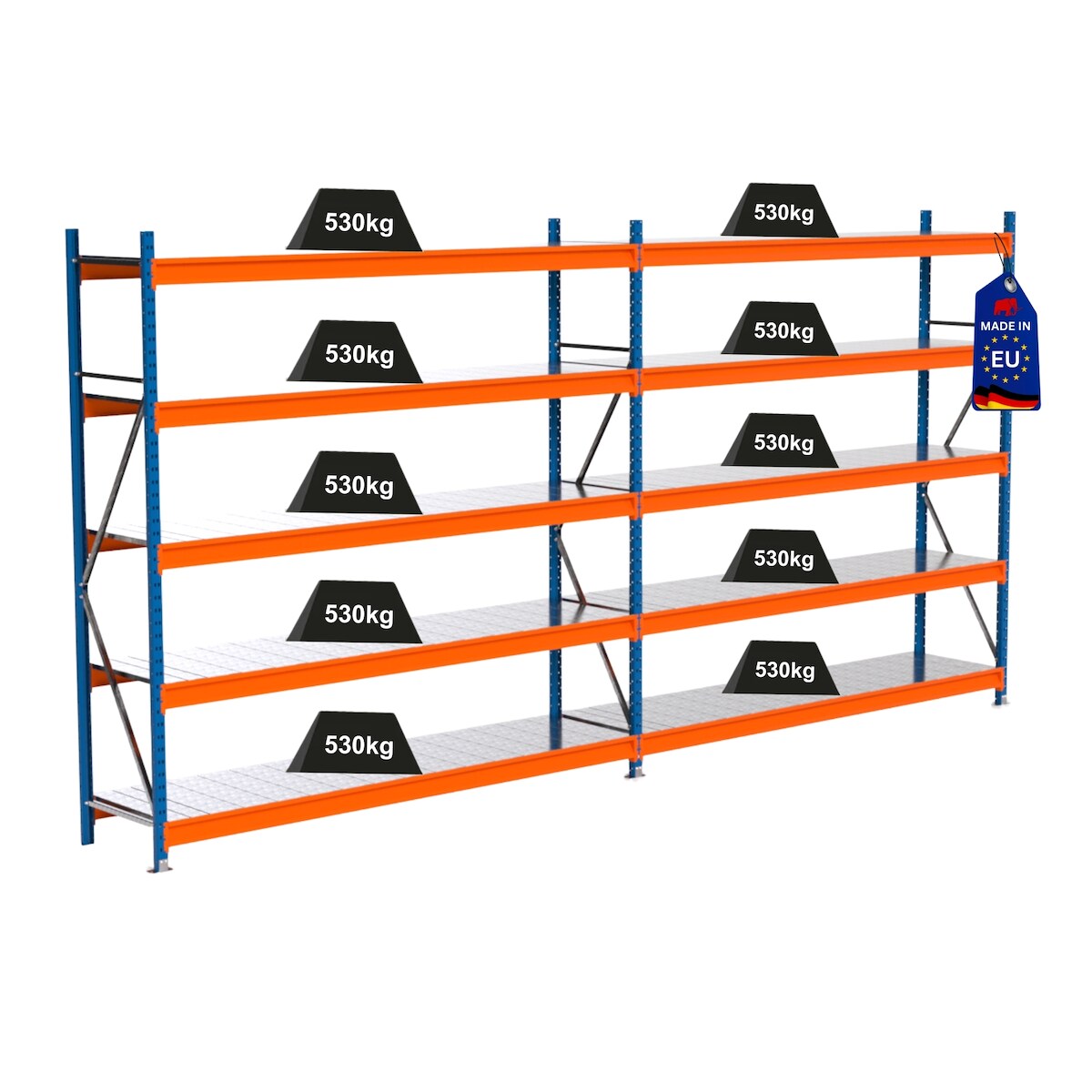 PROREGAL Industrie Schwerlastregal MAXIMUS PRO, Komplettregal, HxBxT 250x500x60cm, 5 Ebenen, Stahlplatten-Fachboden, Fachlast 530 kg, Blau/Orange