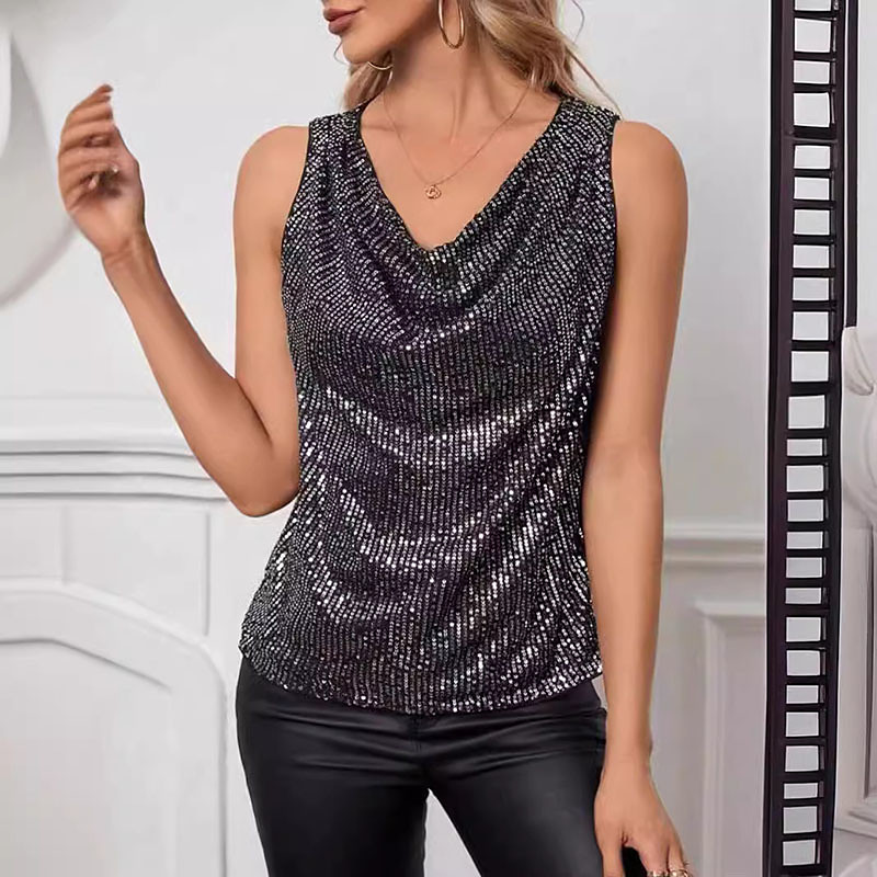 Women's Blouse Sequin Tops Plain Elegant Stylish Western Sleeveless V Neck Regular Tops Holiday Going out Sequins Black Champagne Green Summer Spring Fall