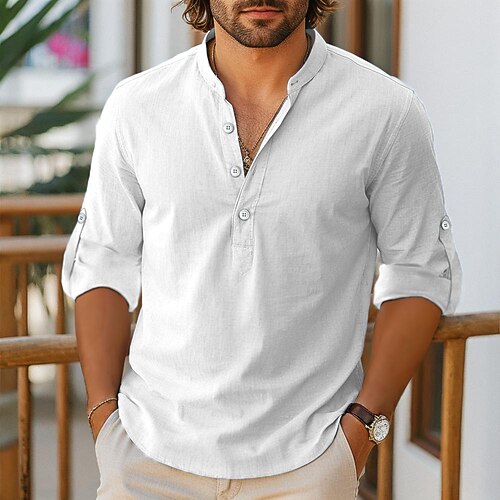 Per uomo Camicia Camicia di lino Camicia popover Camicia Estiva Camicia da Spiaggia Tinta unica Vacanza Ferie Nero Bianco Rosa Blu Manica Lunga Henley Abbigliamento
