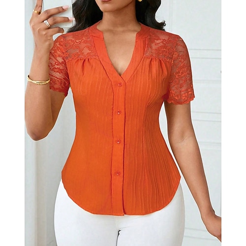 Per donna Camicia Blusa Semplice Elegante Moderno Casual Manica Corta Scollo a V Top Regolari Quotidiano Ferie Uscire Pizzo Bottoni Blu Nero Bianco Giallo Vino Estate Primavera