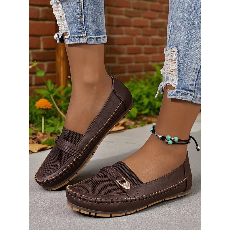 Women's Gray Mesh Moccasin Loafers – Breathable Slip-On Driving Flats with Buckle Detail for Work, Casual Days Autumn Strolls