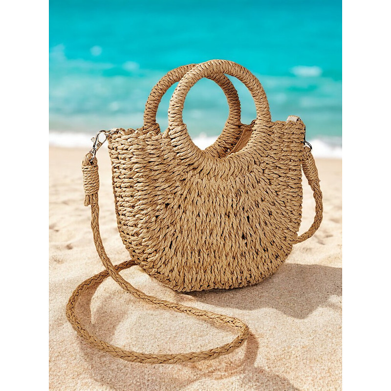 Women's Woven Straw Beach Bag with Round Handles and Long Strap – Boho Summer Handbag for Vacation, Travel and Casual Outfits Pink Orange Brown