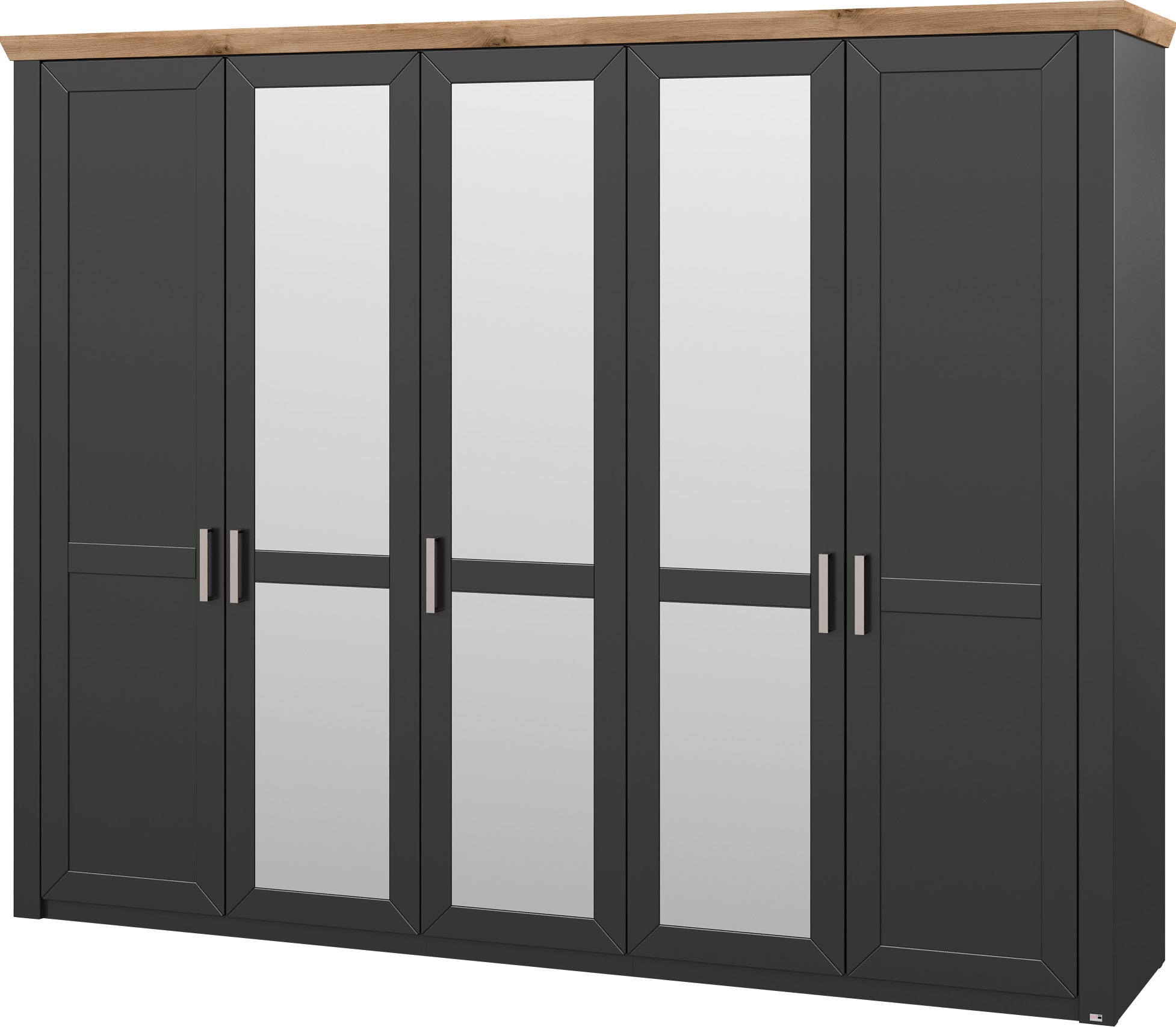 Kleiderschrank "York Schlafen", grau (grau anthrazit, eiche artisan), B:270cm H:210cm T:62cm, Spanplatte, SET ONE BY MUSTERRING, Schränke, mit Holz- und Spiegeltüren, inkl. Kranz in Eiche, Höhe 207 x T60 cm