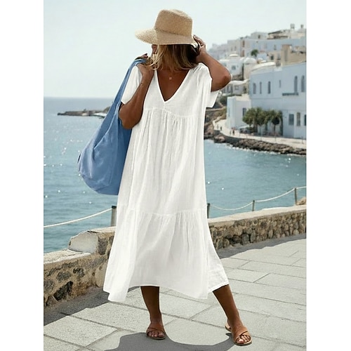 Per donna Abito Midi 100% cotone Abito in cotone e lino Moda Moderno All'aperto Vacanza Ferie Vestibilità comoda Semplice Manica Corta Scollo a V Blu Nero Bianco Verde chiaro Estate Primavera