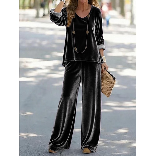 Per donna Set di Pantaloni Manica Lunga Scollo a V Tinta unica Moda Streetwear Casuale Quotidiano All'aperto Nero Vino Viola Autunno Vestibilità comoda