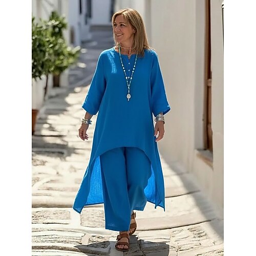 Per donna Set di Pantaloni Finto cotone e lino Manica 3/4 Girocollo Semplice Arricciato Moda Streetwear Casuale Quotidiano All'aperto Blu Nero Bianco Estate Vestibilità comoda