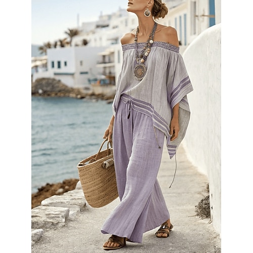 Per donna Set da due pezzi Set di Pantaloni Finto cotone e lino Mezza Manica Senza Spalle A righe Vintage Moda Streetwear Casuale Quotidiano All'aperto Viola Cachi Estate Vestibilità comoda
