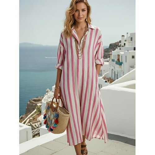 Per donna Abito Midi Abito Camicia Abito in cotone e lino Moda Moderno Quotidiano All'aperto Ferie Vestibilità comoda Semplice Manica Lunga Colletto a Camicia Blu Nero Rosa Rosso Estate Primavera