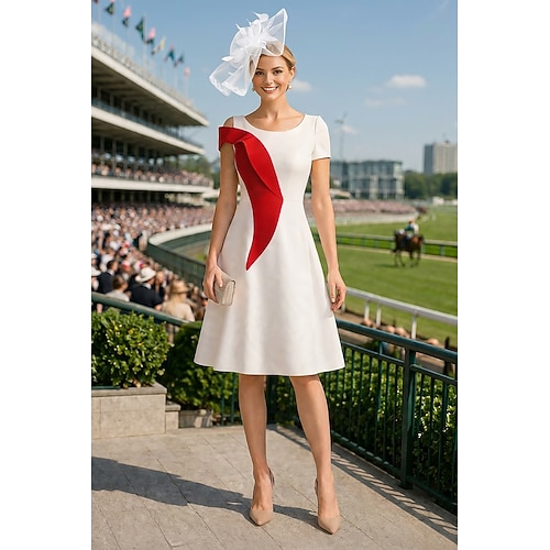 Abito da festa in A-line lungo fino al ginocchio abito da cocktail abito per invitati a matrimoni abito per madri della sposa maniche corte collo a girocollo elegante vintage festa con blocchi di
