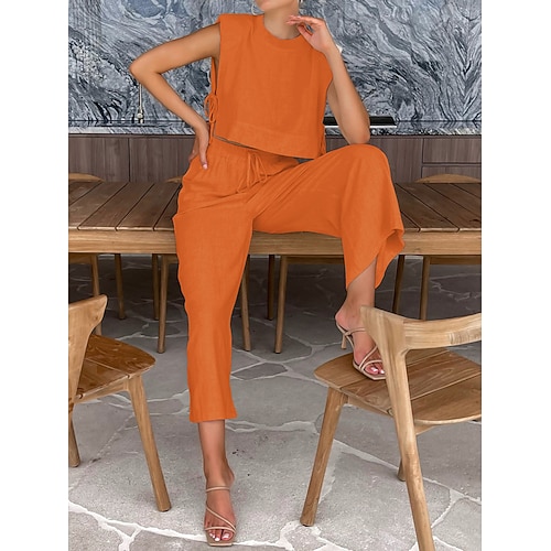 Completo due pezzi da donna, comodo, alla moda, in tinta unita, con elastico in vita, in cotone e lino, canotta, pantaloni, stile street, quotidiano, senza maniche, girocollo, rosa chiaro, rosa, blu, arancione, marrone, estivo.