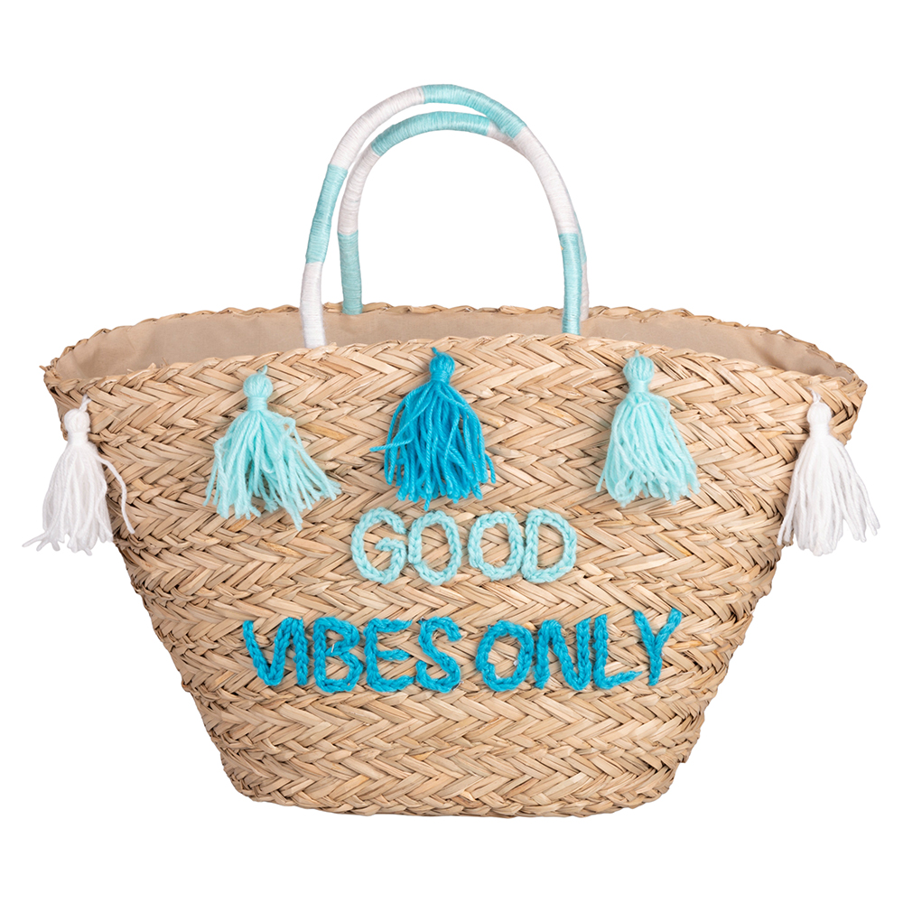<p>Borsa mare in paglia con nappine, Good Vibes Only</p>