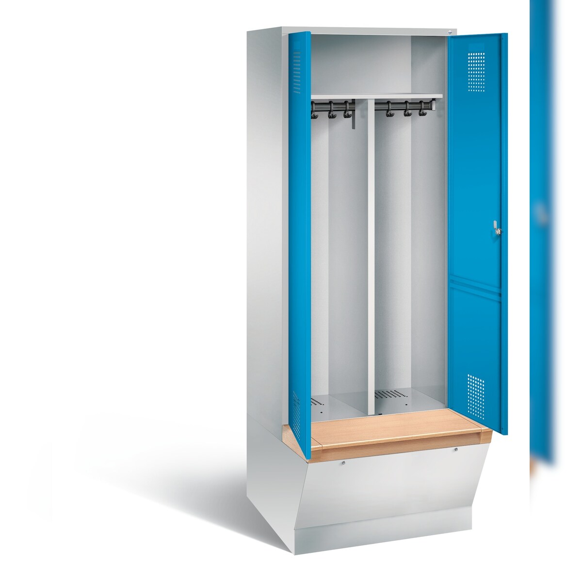 C+P Spind Classic PLUS, Buche untergebaute Sitzbank 2 Abteile, HxBxT 212x60x82cm, Zylinderschloss, Hellgrau/Lichtblau von PROREGAL