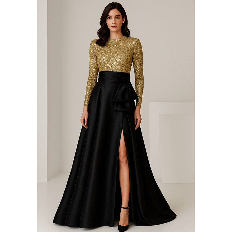 A-Line Floor Length Evening Gown Ball Gown Formal Dress Elegant Silky Long Sleeve Crew Neck Wedding Formal Champagne Mother Of the Bride Dress Satin Sequined with Bow(s) Slit