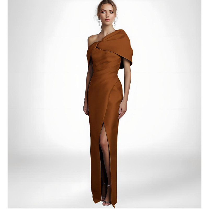 Mermaid Trumpet Floor Length Prom Dresses Evening Gown Ball Gown Formal Dress Elegant Color Block Short Sleeve One Shoulder Wedding Formal Champagne Mother Of the Bride Dress Satin with Slit