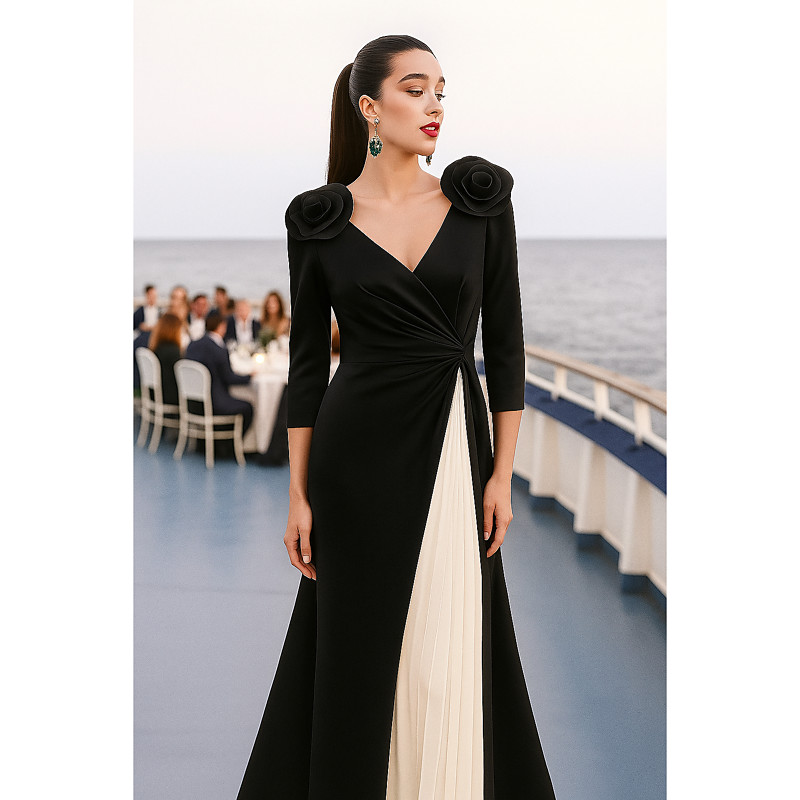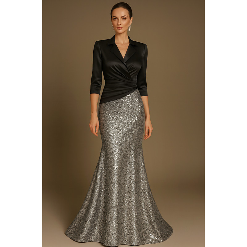 A-Line Floor Length Prom Dresses Evening Gown Ball Gown Formal Dress Elegant Color Block Glittering Half Sleeve Lapel Wedding Formal Stretch Satin Sequined with Glitter Pleats